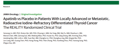 2021年12月16日,权威医学杂志《JAMA Oncology》(影响因子31.777)在线发表阿帕替尼的一项III期临床研究(REALITY)——甲磺酸阿帕替尼片治疗局部进展/转移性放射性碘难治性分化型甲状腺癌(RAIR-DTC)患者的多中心、随机、双盲、安慰剂对照临床研究。此研究由北京协和医院的林岩松教授和南京金陵医院的秦叔逵教授发起,在全国21个研究中心展开,由PG医药中央医学事务部团队支持完成。