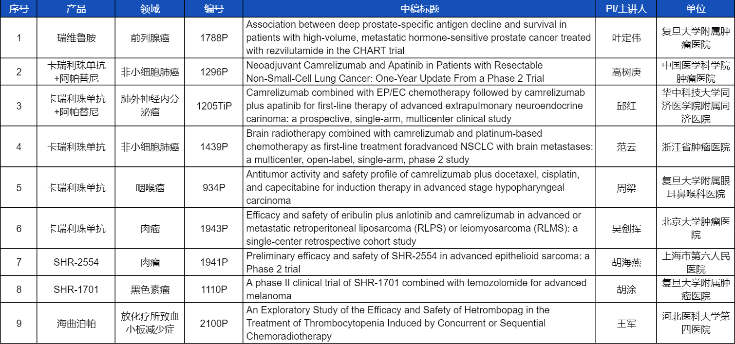 在非小细胞肺癌、咽喉癌、肉瘤、前列腺癌、黑色素瘤等多个领域,卡瑞利珠单抗、阿帕替尼、瑞维鲁胺、SHR-1701、SHR2554等创新产品相关研究一共入选了8项壁报展示。此外,PG医药自主研发的血小板生成素受体激动剂(TPO-RA)海曲泊帕在放化疗所致血小板减少领域的探索性研究显示良好的疗效,入选壁报展示。