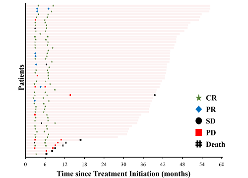 12W时获得完全缓解和部分缓解(CR+PR)的患者,2年PFS率达到90.2%(95% CI:76.1-96.2),12W时疾病稳定和疾病进展(SD+PD)的患者2年PFS率为55.6%(95% CI:20.4-80.5)(P<0.05)。12W时CR+PR患者的2年OS率为95.1%(95% CI:81.9-98.8),12W时SD+PD患者2年OS率为66.7%(95% CI:28.2-87.8)(P<0.05)。